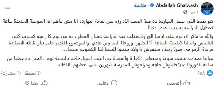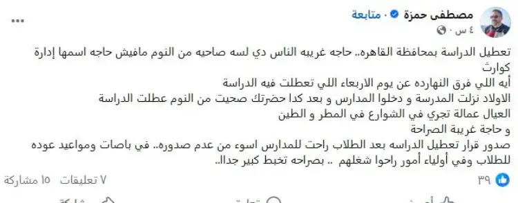 طالب أولياء الأمور بإنشاء غرف عمليات فعالة تعمل على مدار الساعة، مع منح صلاحيات أكبر للإدارات التعليمية لاتخاذ قرارات سريعة في مثل هذه الحالات، بدلا من انتظار قرارات مركزية قد تصدر بعد بدء اليوم الدراسي.