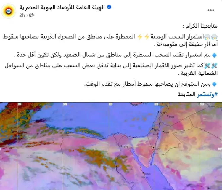 - أمطار خفيفة إلى متوسطة على السواحل الشمالية وشمال الوجه البحري