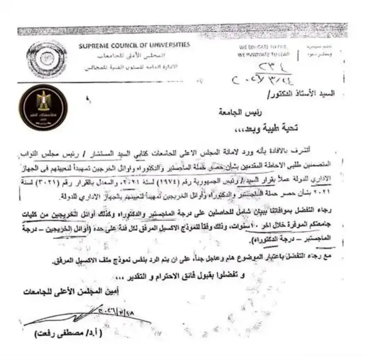 كشفت الوثيقة الرسمية الصادرة عن الأمين العام للمجلس، أ.د. مصطفى رفاعي، أن هذا الحصر يشمل جميع خريجي الجامعات المصرية من حملة الماجستير والدكتوراه، مع التركيز على تضمين أوائل الخريجين من كل كلية، وفق بيانات دقيقة تشمل التقديرات والدرجات العلمية والتخصصات، وذلك بهدف تكوين قاعدة بيانات متكاملة يسهل على الجهات المختصة الاستفادة منها في التعيينات المستقبلية.