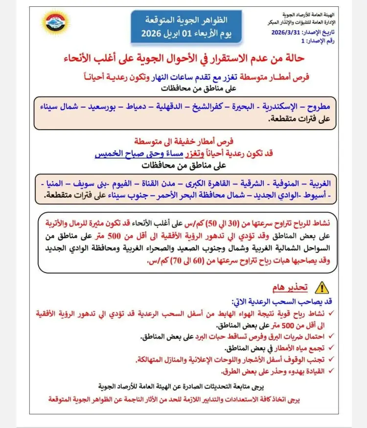 أصدرت الهيئة العامة للأرصاد الجوية بيانا عاجلا حول حالة الطقس غدا الأربعاء الموافق 1 أبريل لعام 2026، حيث حذرت من سيطرة حالة من عدم الاستقرار في الأحوال الجوية على أغلب أنحاء البلاد، مع توقعات بظهور سحب رعدية ونشاط ملحوظ للرياح وتفاوت في كميات الأمطار بين محافظات الوجه البحري والقاهرة الكبرى.