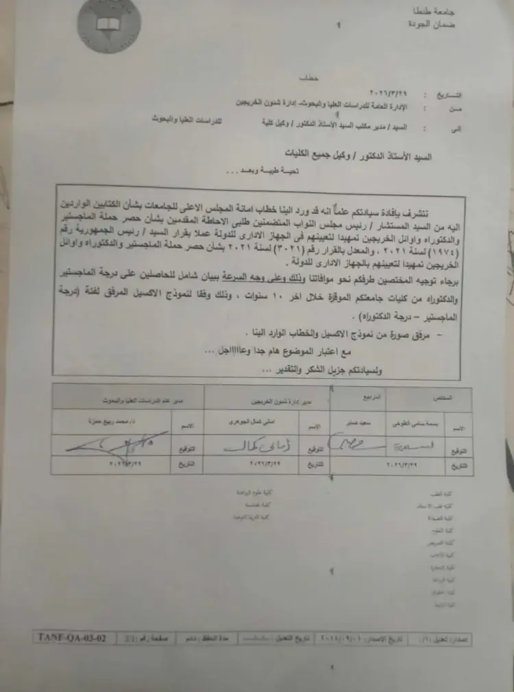 وأكد الخطاب الرسمي الممهور بتوقيعات مسؤولي إدارة شئون الخريجين والدراسات العليا أن هذا الموضوع يحظى بأهمية قصوى وعاجلة جدا، نظرا لارتباطه المباشر بخطط الدولة لتطوير الجهاز الإداري ورفده بالخبرات الأكاديمية، وهو ما يستلزم سرعة التنسيق بين إدارات شئون الخريجين وعمداء الكليات لإنهاء عمليات التدقيق والرفع قبل المواعيد النهائية المحددة من قبل رئاسة مجلس الوزراء.