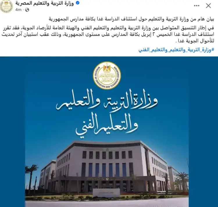 وفي إطار التنسيق المتواصل بين وزارة التربية والتعليم والتعليم الفني والهيئة العامة للأرصاد الجوية، فقد تقرر استئناف الدراسة غدا الخميس ٢ إبريل بكافة المدارس على مستوى الجمهورية، وذلك عقب استبيان آخر تحديث للأحوال الجوية غدا .