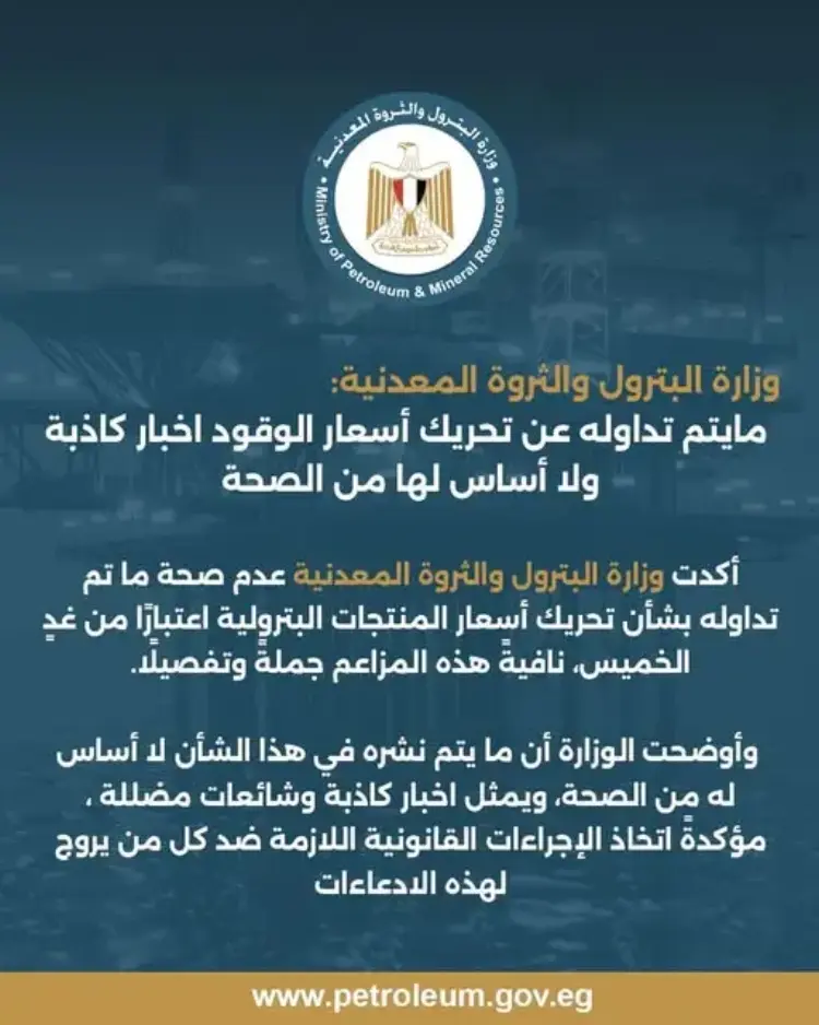 أوضحت وزارة البترول والثروة المعدنية أن ما يُنشر حول زيادة تحريك أسعار المنتجات البترولية يُعد شائعات مضللة وأخبارا كاذبة تهدف إلى إثارة البلبلة بين المواطنين.