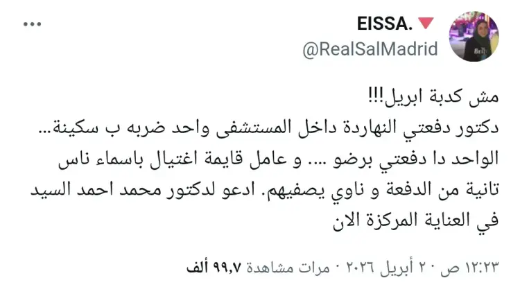 الطبيب محمد أحمد السيد يتعرض للطعن على يد زميلة أمام مستشفى جمال عبدالناصر بالإسكندرية