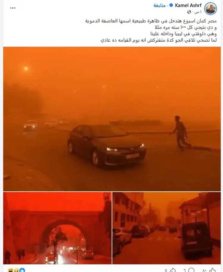 شددت الهيئة على أنه لا توجد أي عاصفة دموية متوقعة أن تضرب مصر خلال الفترة المقبلة، في محاولة لطمأنة المواطنين، خاصة مع تزايد القلق نتيجة تداول صور غير معتادة لسماء حمراء وانعدام الرؤية في بعض الدول.