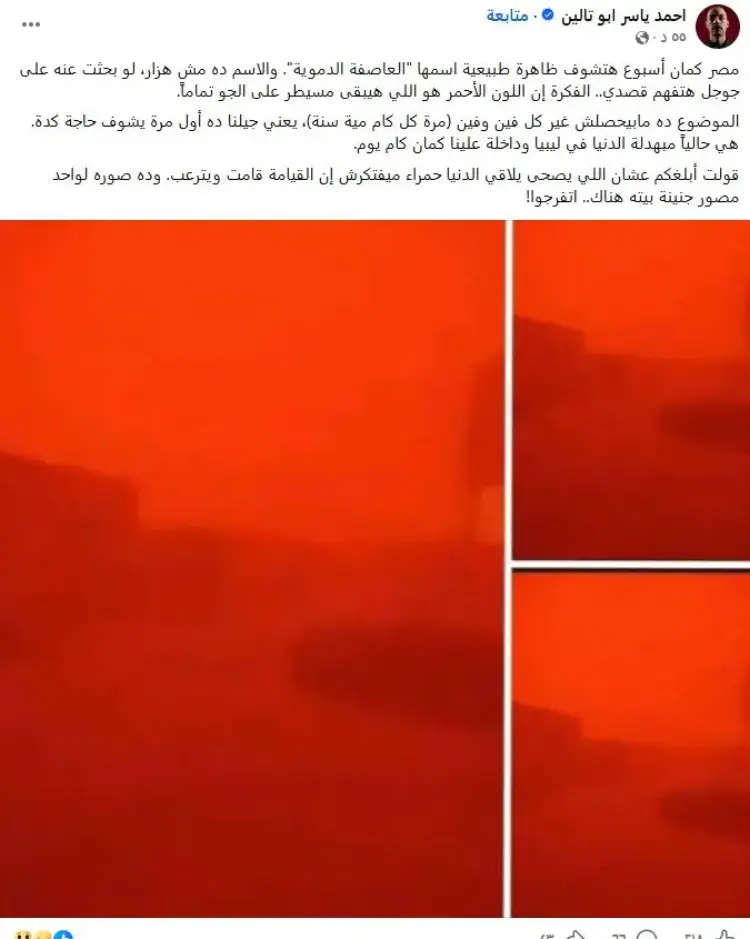 أثارت العاصفة الدموية حالة من الجدل الواسعة خلال الساعات الأخيرة الماضية عبر مواقع التواصل الاجتماعي المختلفة بين المواطنين، وخاصة مع انتشار العديد من الصور التي توثق تحول لون السماء إلى الأحمر في بعض الدول.