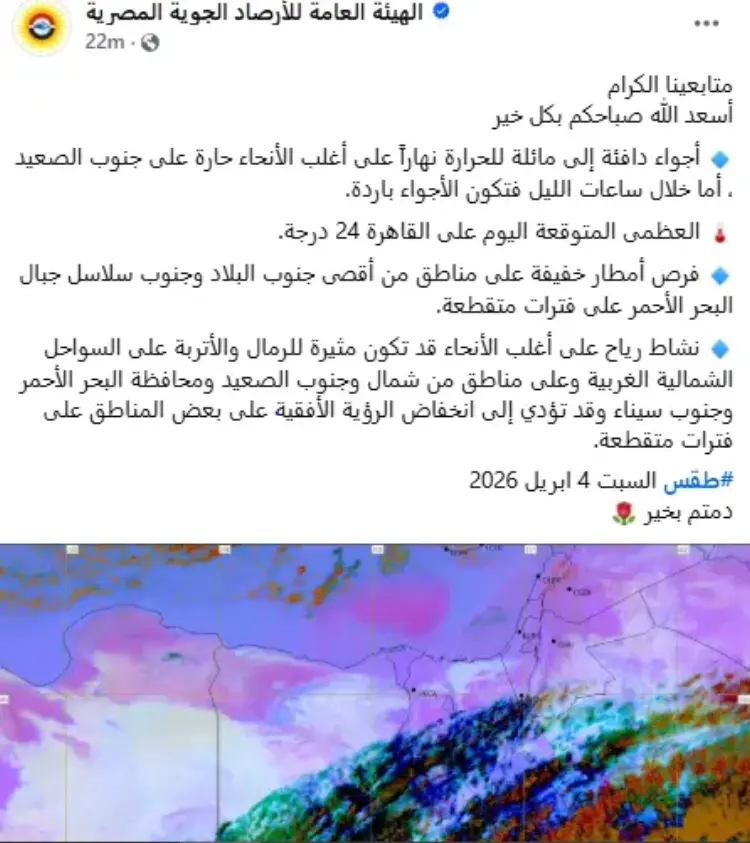 طقس اليوم السبت 4 أبريل 2026