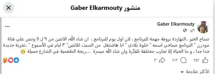 وأشار جابر في منشوره، إلى أن مواعيد برنامجه الجديد ستعرض في تمام الساعة التاسعة صباحا، وتستمر حتى الحادية عشرة والنصف.