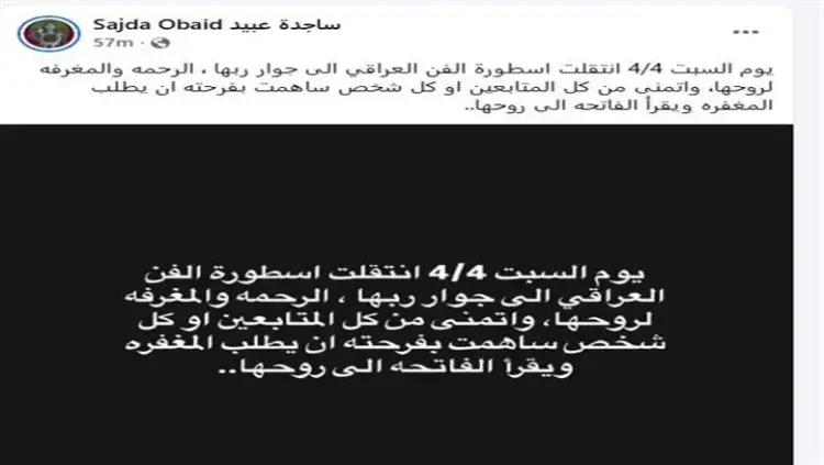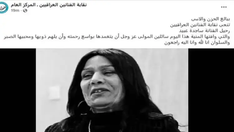 نعت نقابة الفنانين العراقيين المطربة ساجدة عبيد التي فارقت الحياة اليوم السبت 4 أبريل 2026 بعد أزمة صحية حادة، وسط تساؤلات مكثفة من جمهورها حول سبب وفاة الفنانة ساجدة عبيد التي غادرت عالمنا تاركة إرثا فنيا كبيرا في الغناء الريفي والجوبي، وذلك عقب تدهور مفاجئ في حالتها الصحية استلزم نقلها إلى المستشفى لتلقي العلاج الطارئ.