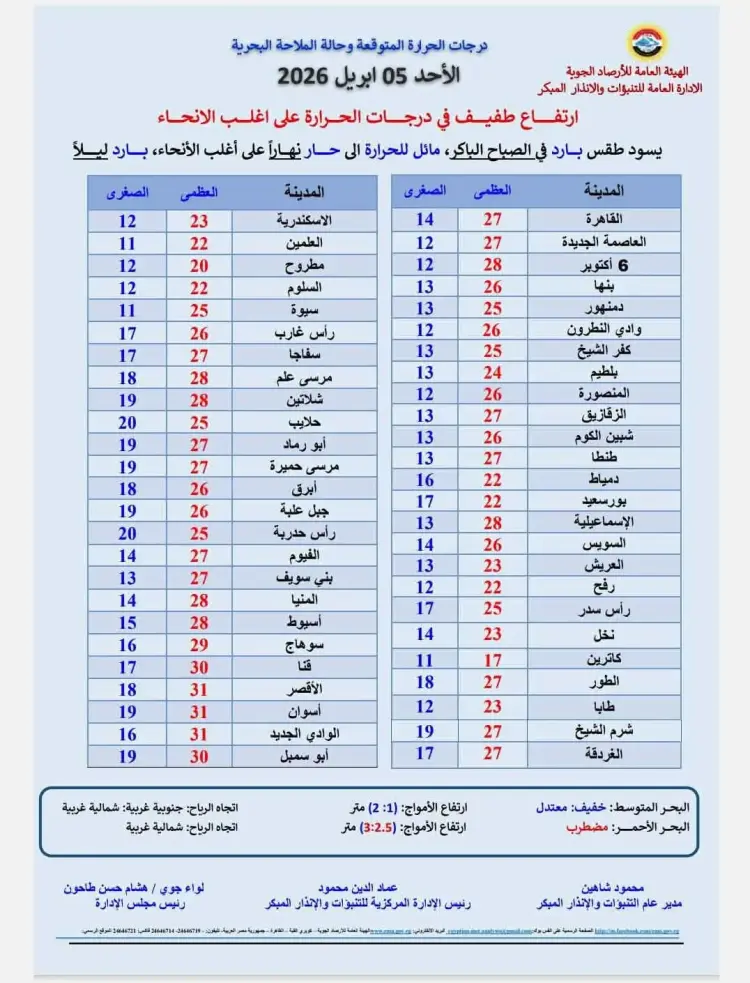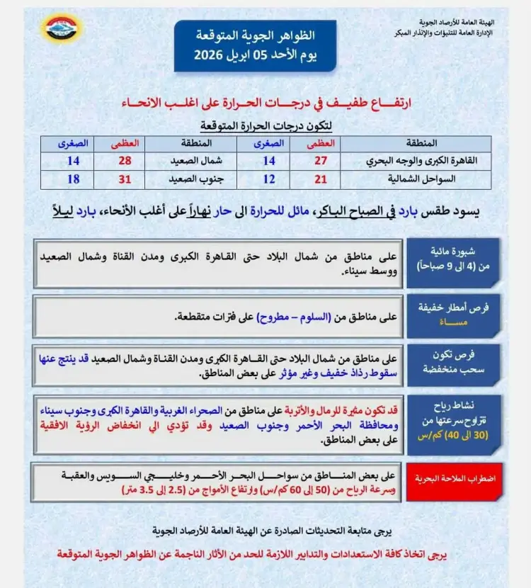 أعلنت الهيئة العامة للأرصاد الجوية عن توقعات حالة الطقس ودرجات الحرارة غدا الأحد الموافق 5 أبريل 2026، حيث تشهد البلاد ارتفاعا طفيفا في درجات الحرارة على أغلب الأنحاء، ويسود طقس بارد في الصباح الباكر، ومائل للحرارة إلى حار نهارا على أغلب الأنحاء، بينما يظل باردا خلال ساعات الليل المتأخرة وفي الصباح الباكر.
