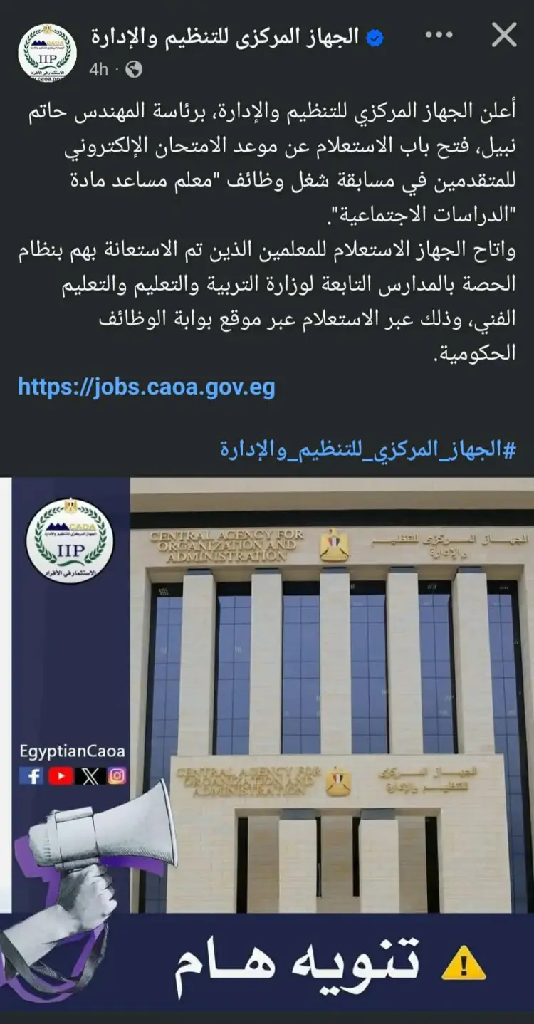 أعلن الجهاز المركزي للتنظيم والإدارة عبر صفحاته الرسمية على فيسبوك برئاسة المهندس حاتم نبيل اليوم الأحد 5 إبريل 2026 عن إتاحة الاستعلام الإلكتروني للمتقدمين في مسابقة شغل وظائف معلم مساعد مادة «الدراسات الاجتماعية» من المعلمين الذين سبق الاستعانة بهم بنظام الحصة بمدارس وزارة التربية والتعليم والتعليم الفني عبر بوابة الوظائف الحكومية.