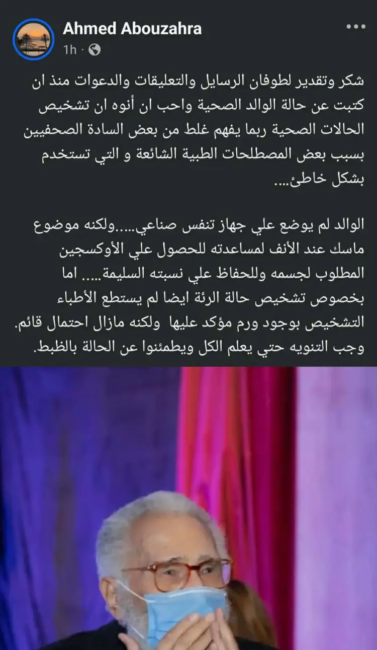 نفى نجل الفنان الكبير في منشوره الرسمي ما تردد حول وضع والده على جهاز تنفس صناعي، موضحا أن والده وضع تحت ماسك طبي عند الأنف فقط لمساعدته في الحصول على مستويات الأكسجين المطلوبة لجسمه وللحفاظ على نسبته السليمة في الدم، ومشيرا في الوقت ذاته إلى وجود سوء فهم لبعض المصطلحات الطبية الشائعة التي قد تستخدم بشكل خاطئ في التقارير الصحفية المتداولة مؤخرا.