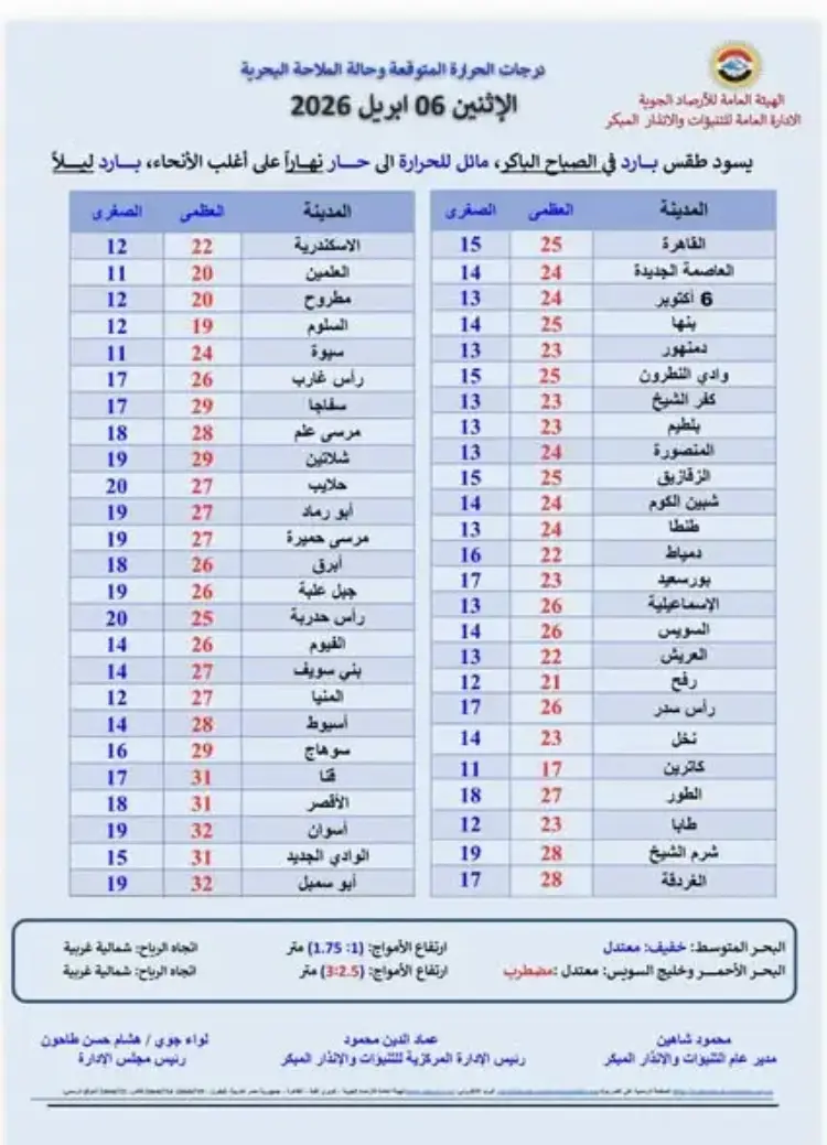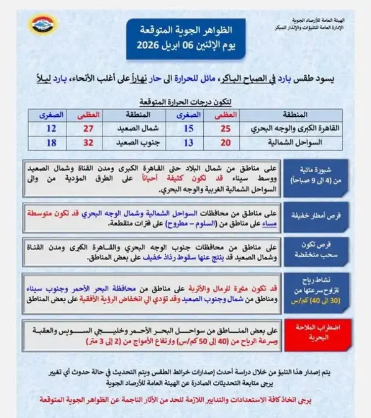 كشفت الهيئة العامة للأرصاد الجوية عن تفاصيل حالة طقس غدا الإثنين الموافق 6 أبريل 2026، حيث يسود طقس مائل للحرارة إلى حار نهارا على أغلب الأنحاء، بينما يميل للبرودة خلال ساعات الصباح الباكر والليل المتأخر، مما يستوجب الحذر عند اختيار نوعية الملابس لتجنب نزلات البرد المباغتة نتيجة تباين درجات الحرارة بين النهار والليل.
