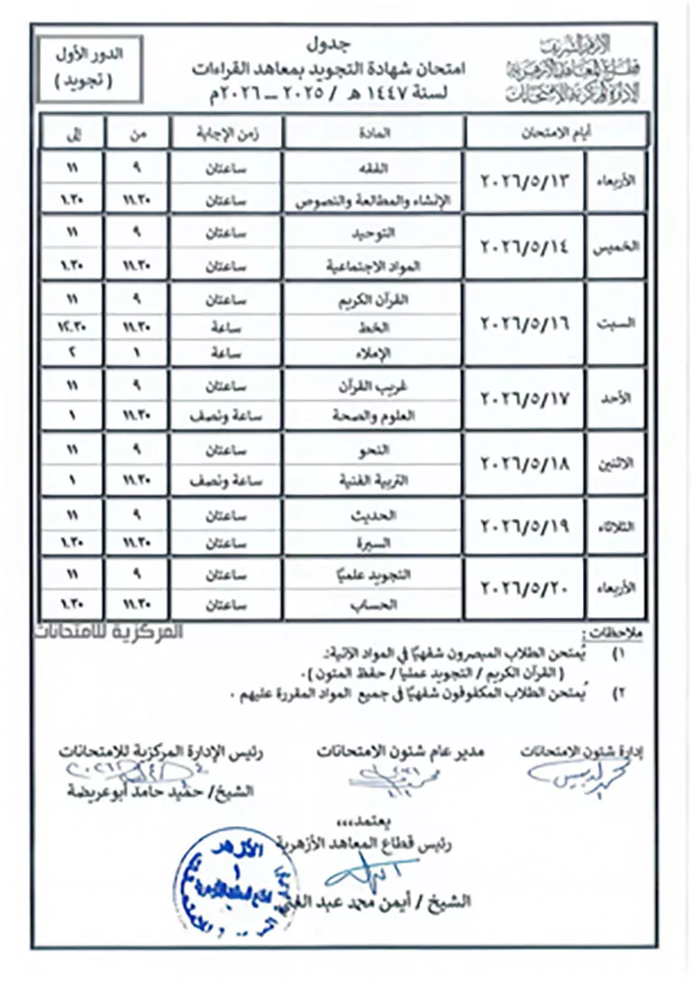 جدول امتحانات شهادة التجويد بمعاهد القراءات 1447هـ/ 2025-2026م