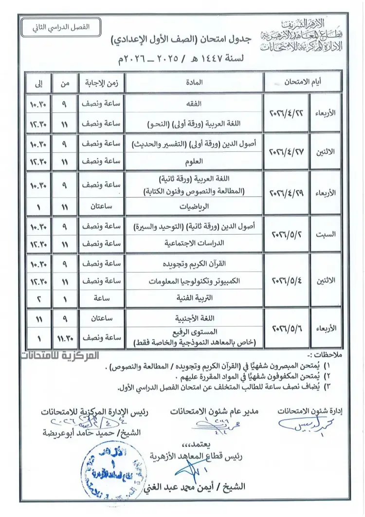 جدول امتحانات الصف الأول الإعدادي الأزهري الترم الثاني 2026