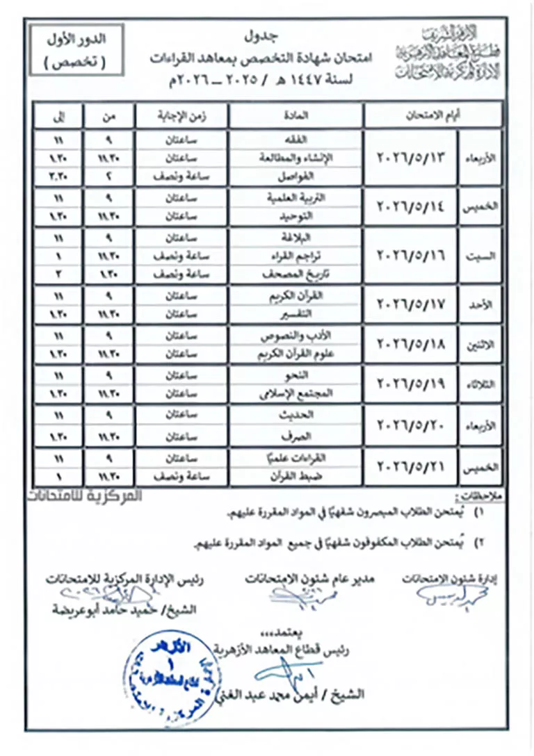 جدول امتحانات شهادة التخصص بمعاهد القراءات للعام الدراسي 1447هـ/ 2025-2026م
