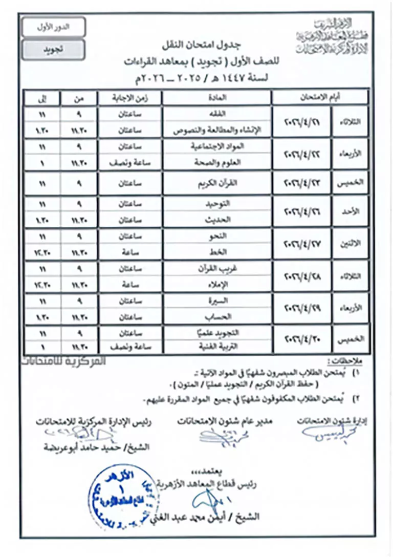 جدول امتحانات الصف الأول تجويد بمعاهد القراءات 1447هـ/ 2025-2026م