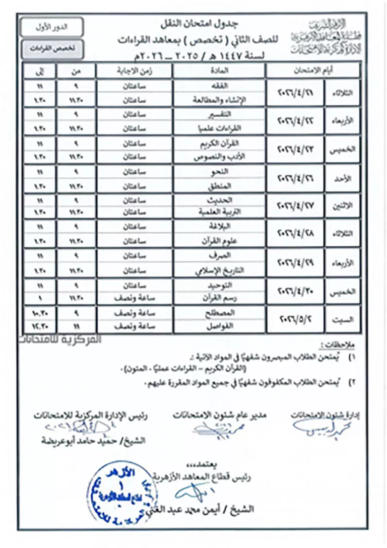 جدول امتحانات الصف الثاني تخصص بمعاهد القراءات 1447هـ/ 2025-2026م
