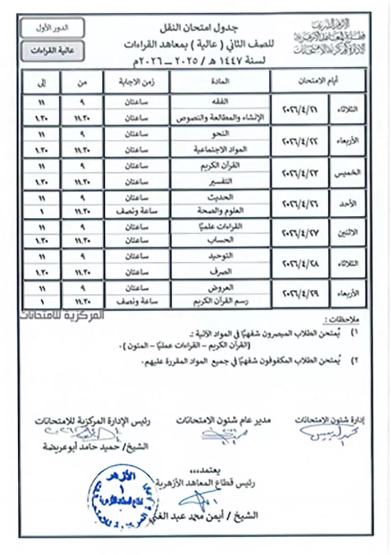 جدول امتحانات الصف الثاني عالية بمعاهد القراءات 1447هـ/ 2025-2026م