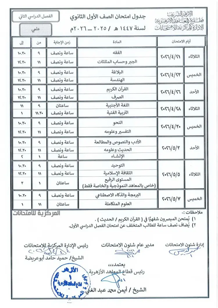 جاء جدول امتحانات أولى ثانوي أزهر الترم الثاني 2026 علمي على النحو التالي: