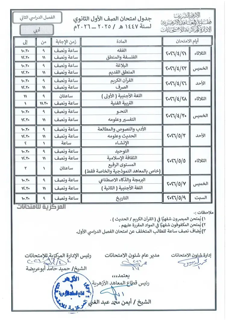 جدول امتحانات أولى ثانوي الترم الثاني أزهر 2026 أدبي