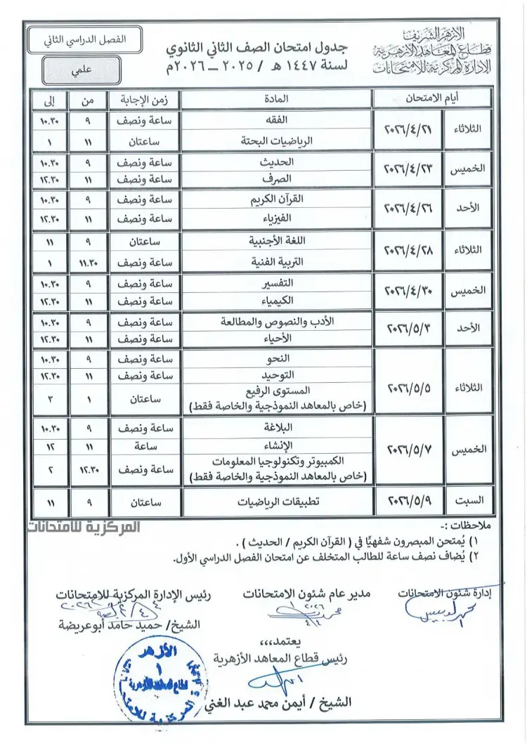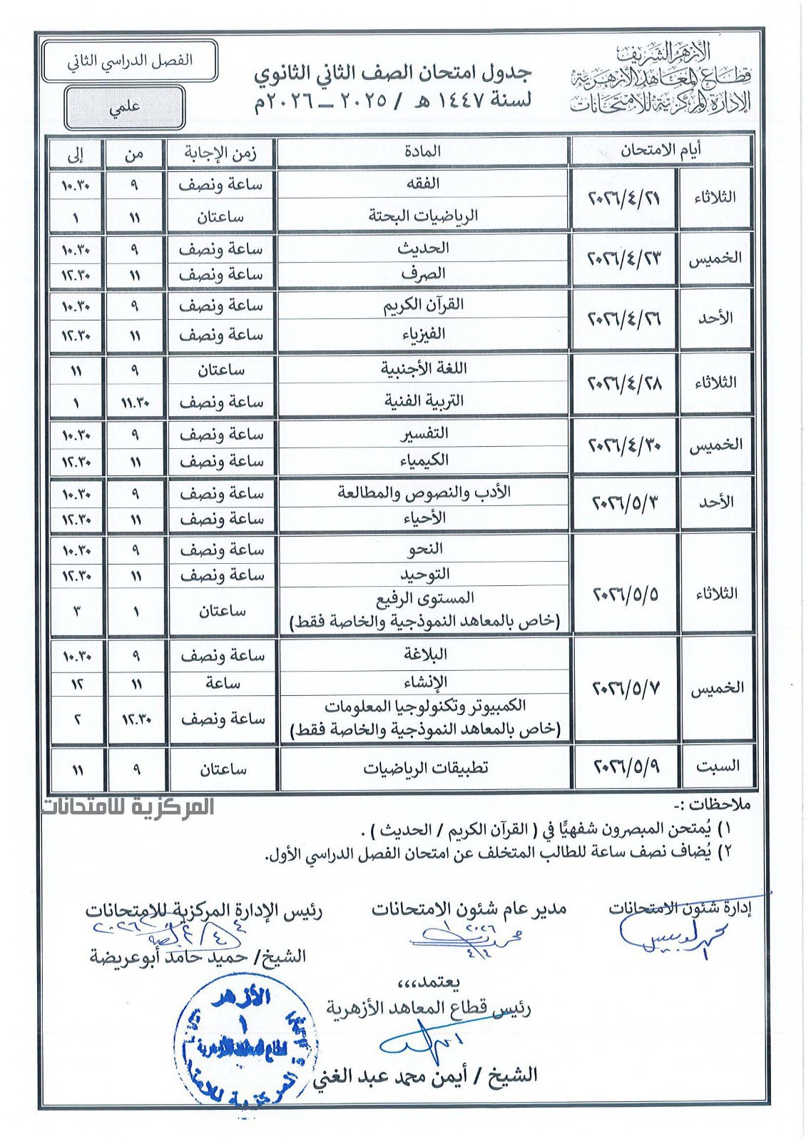 جدول امتحانات تانية ثانوي أزهر الترم الثاني 2026 علمي