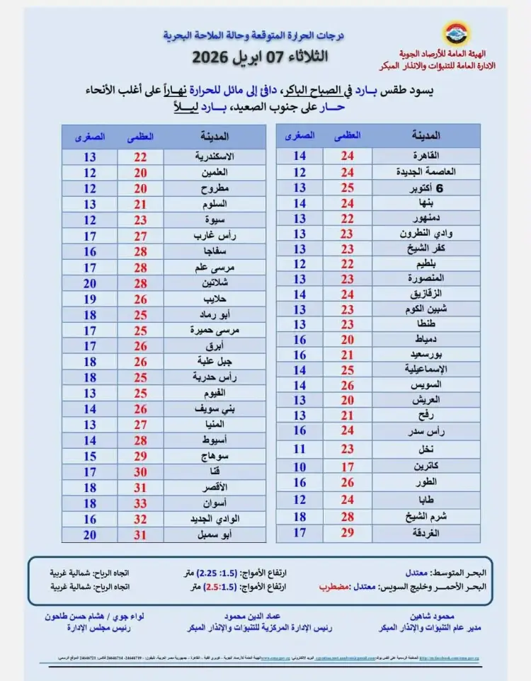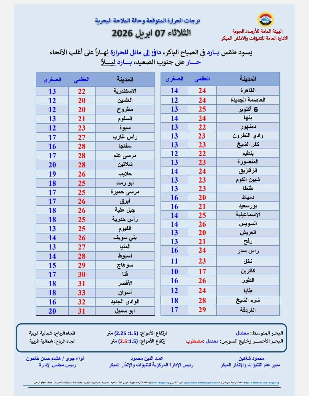 أما العاصمة الإدارية الجديدة فتكون 24 للعظمى و14 للصغرى، والإسكندرية 22 للعظمى و13 للصغرى، والمنصورة 23 للعظمى و13 للصغرى، وبورسعيد 21 للعظمى و16 للصغرى، وقنا 30 للعظمى و17 للصغرى، وأسوان 33 للعظمى و18 للصغرى. وتتوقع هيئة الأرصاد تشكل الشبورة المائية من الرابعة وحتى التاسعة صباحا على الطرق القريبة من المسطحات المائية وشمال البلاد وصولا إلى القاهرة الكبرى.