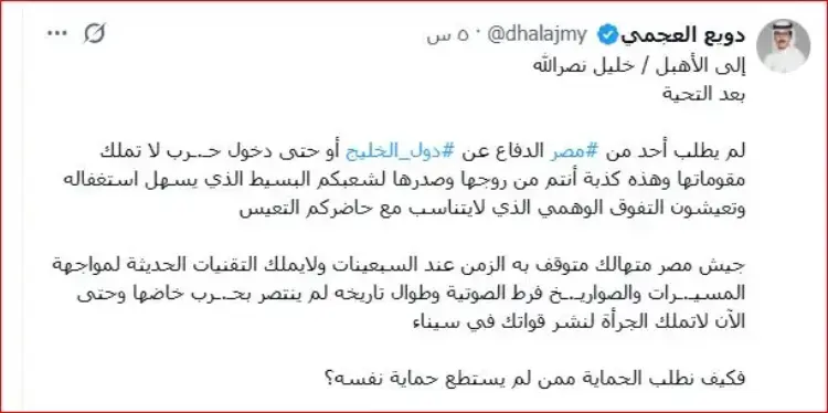 ودوّن العجمي على موقع اكس غاضبا: «لم يطلب أحد من مصر الدفاع عن دول أو حتى دخول حـ.ـرب لا تملك مقوماتها وهذه كذبة أنتم من روجها وصدرها لشعبكم البسيط الذي يسهل استغفاله وتعيشون التفوق الوهمي الذي لايتناسب مع حاضركم التعيس جيش مصر متهالك متوقف به الزمن عند السبعينات ولايملك التقنيات الحديثة لمواجهة المسيـ.ـرات والصواريـ.ـخ فرط الصوتية وطوال تاريخه لم ينتصر بحـ.ـرب».