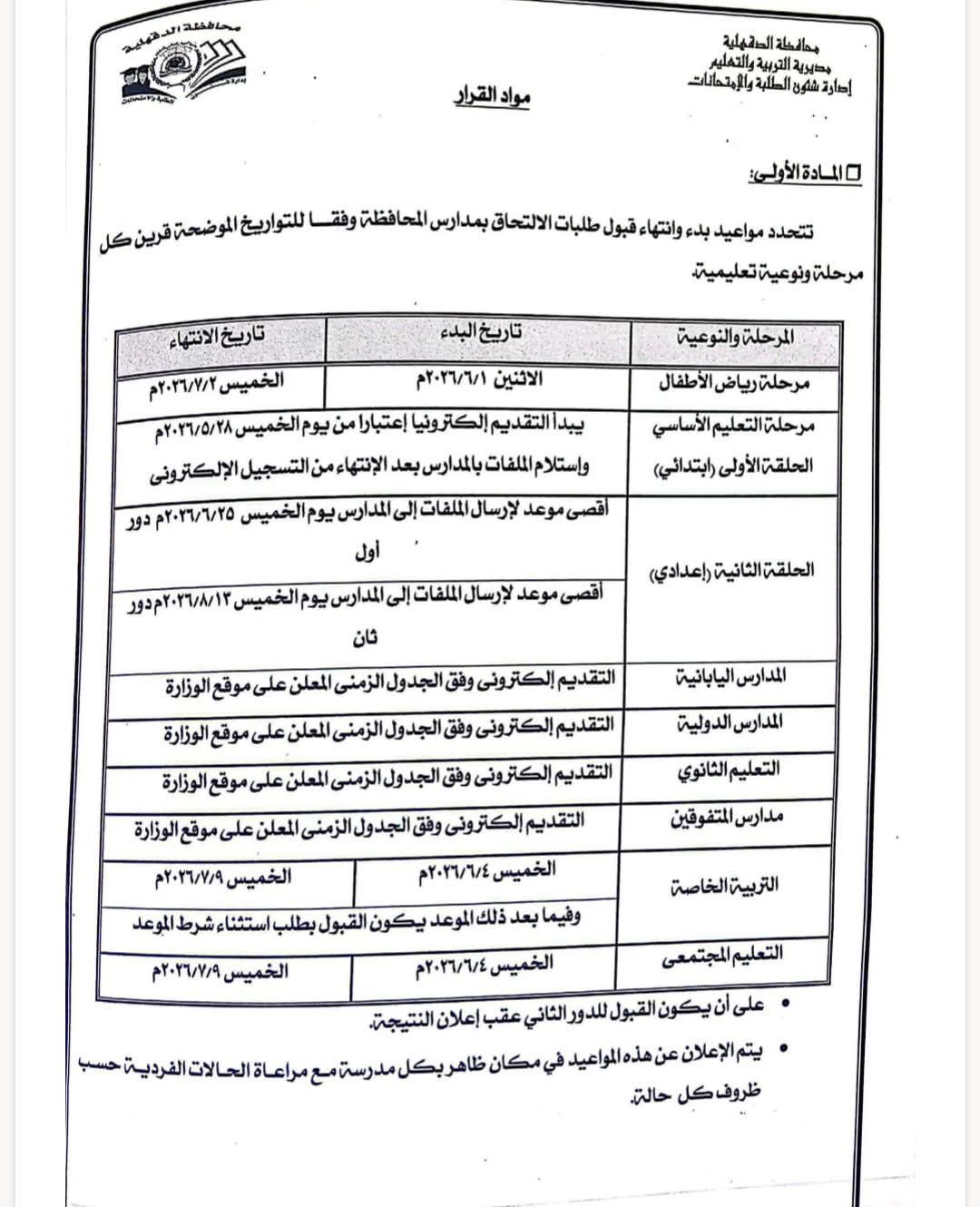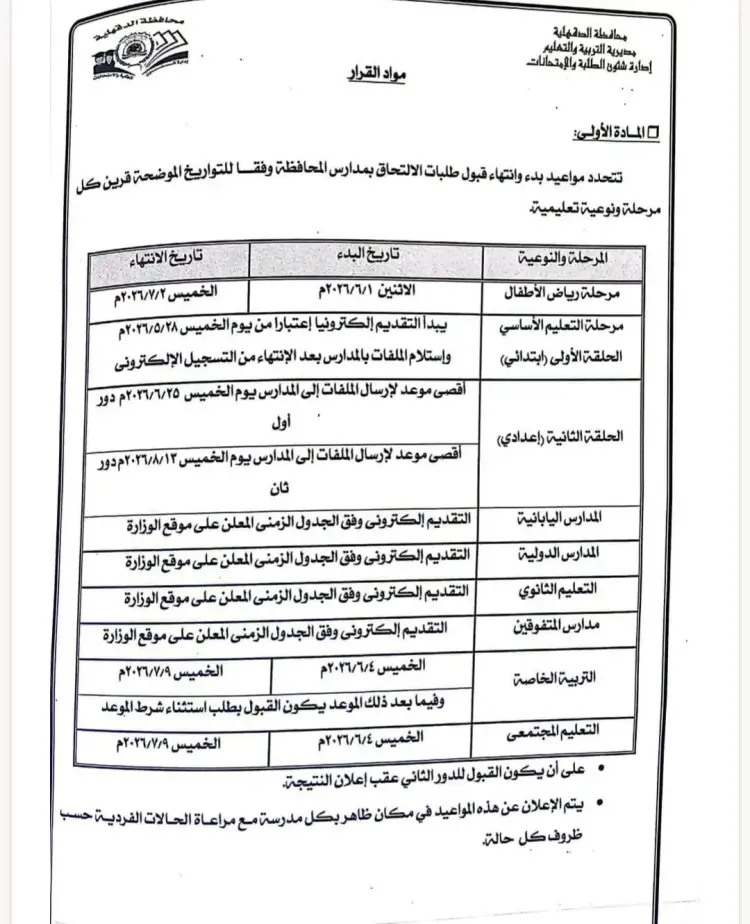 وحددت المديرية ضوابط مشددة لتنظيم عملية التقديم، مشيرة إلى أن مرحلة التعليم الأساسي الحلقة الأولى ابتدائي ستبدأ في تلقي الطلبات إلكترونيا من يوم الخميس 28 مايو 2026، حيث أكدت الأوراق الرسمية الصادرة عن إدارة شئون الطلبة والامتحانات ضرورة الانتهاء من التسجيل الرقمي أولا قبل البدء في إجراءات تسليم الملفات الورقية داخل المدارس.