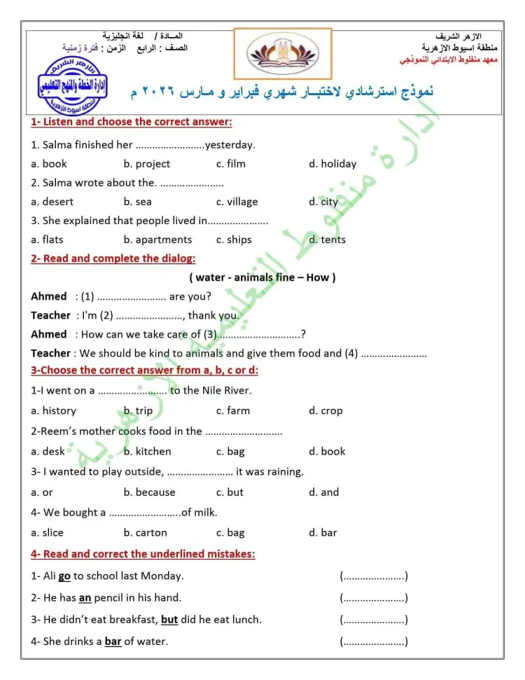 نماذج استرشادية إنجليزي رابعة ابتدائي أزهر شهر مارس 2026