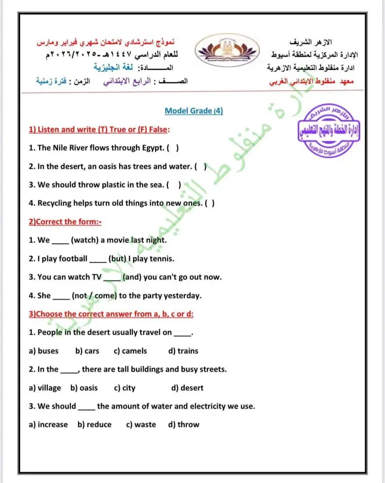 تتضمن نماذج استرشادية إنجليزي رابعة ابتدائي أزهر شهر مارس 2026 مجموعة متنوعة من الأسئلة التي تقيس مستوى استيعاب الطلاب ومعلوماتهم قبل أداء الاختبار الشهري الأول في الفصل الدراسي الثاني للعام 2025 2026، ومن بين هذه الأسئلة ما يلي:
