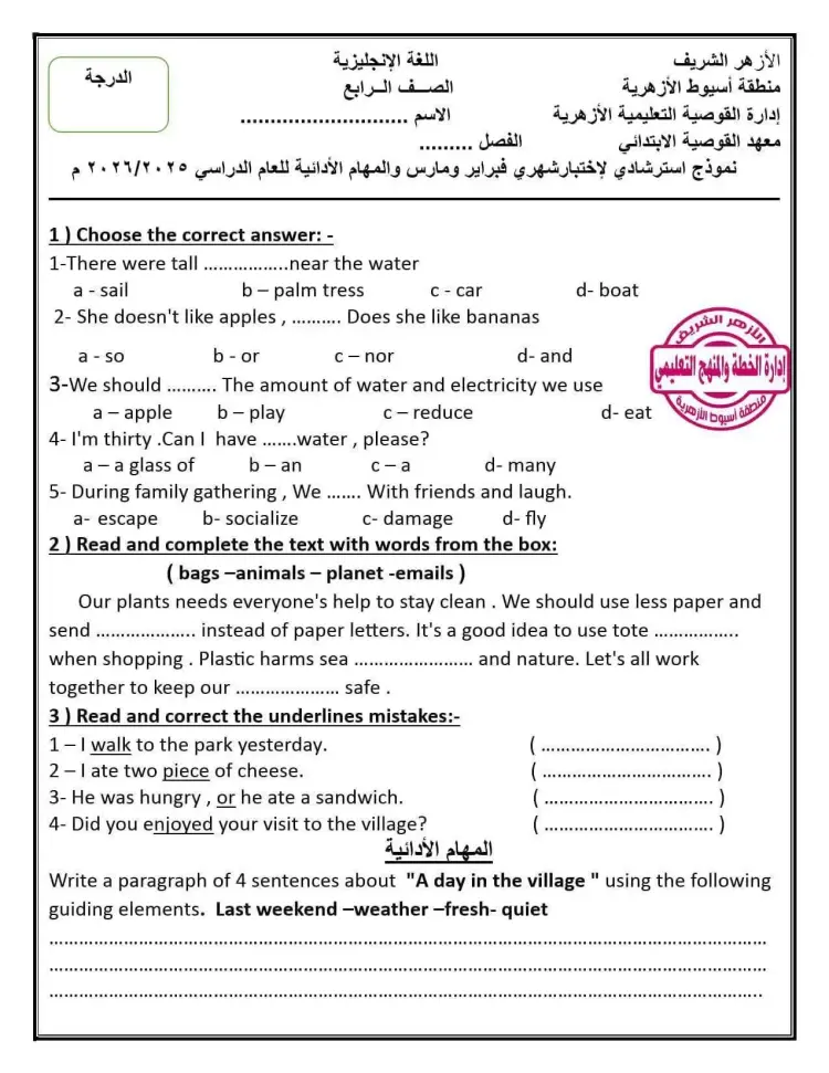 نماذج استرشادية للصف الرابع الابتدائي أزهر 2026 إنجليزي شهر مارس