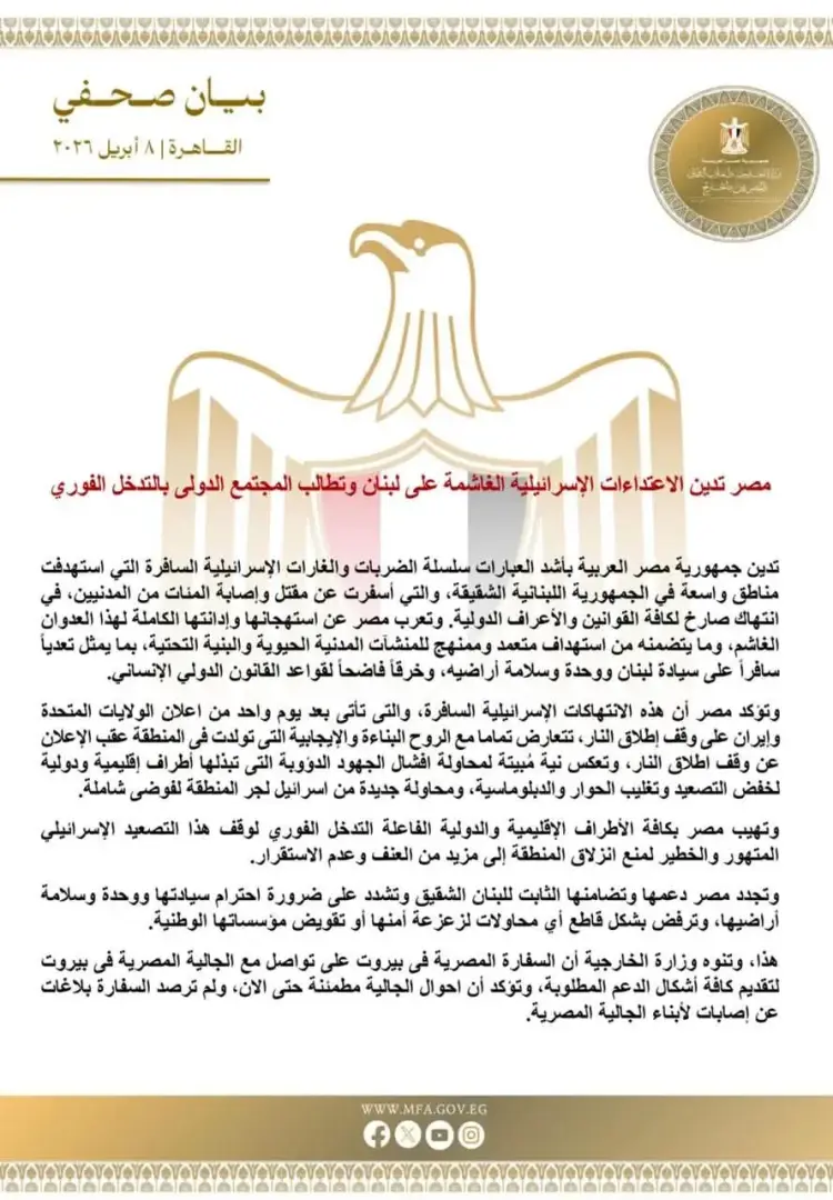 وطالبت الحكومة المصرية المجتمع الدولي والأطراف الإقليمية الفاعلة بالتدخل الفوري والحاسم لوقف ما وصفته بالتصعيد المتهور، محذرة من انزلاق المنطقة إلى مزيد من العنف وعدم الاستقرار، وشددت على موقفها الثابت والداعم للبنان الشقيق في مواجهة هذا العدوان، مجددة رفضها القاطع لأي محاولات تستهدف زعزعة أمن واستقرار الدولة اللبنانية أو تقويض مؤسساتها الوطنية تحت أي ذريعة.