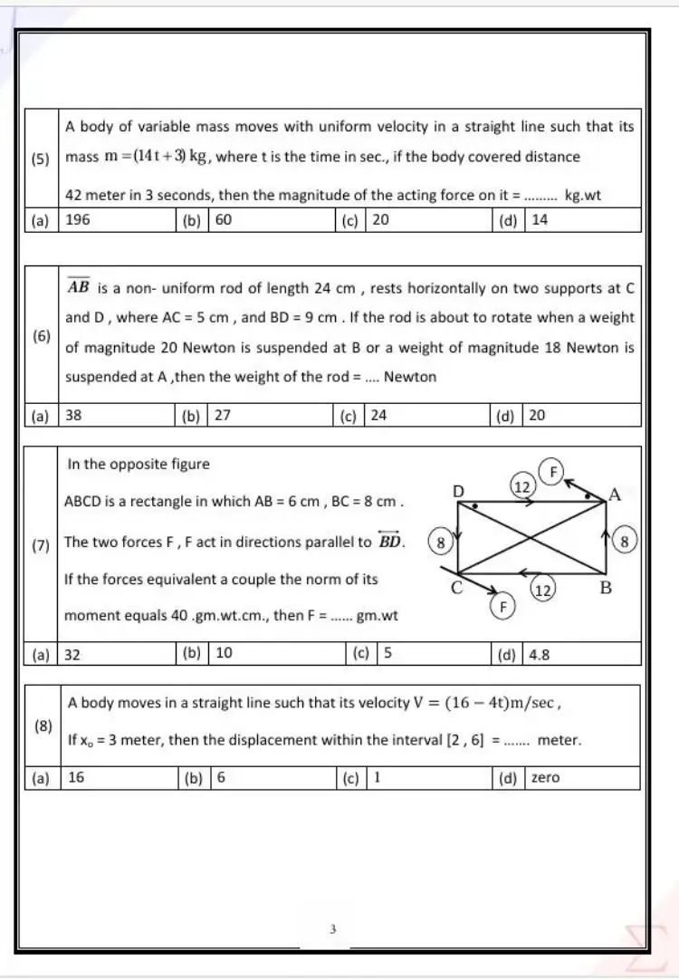ABCD is a rectangle in which AB = 6 cm, BC = 8 cm. The two forces F, F act in directions parallel to $\overline{BD}. If the forces equivalent a couple the norm of its moment equals 40 gm.wt.cm., then F = ...... gm.wt.