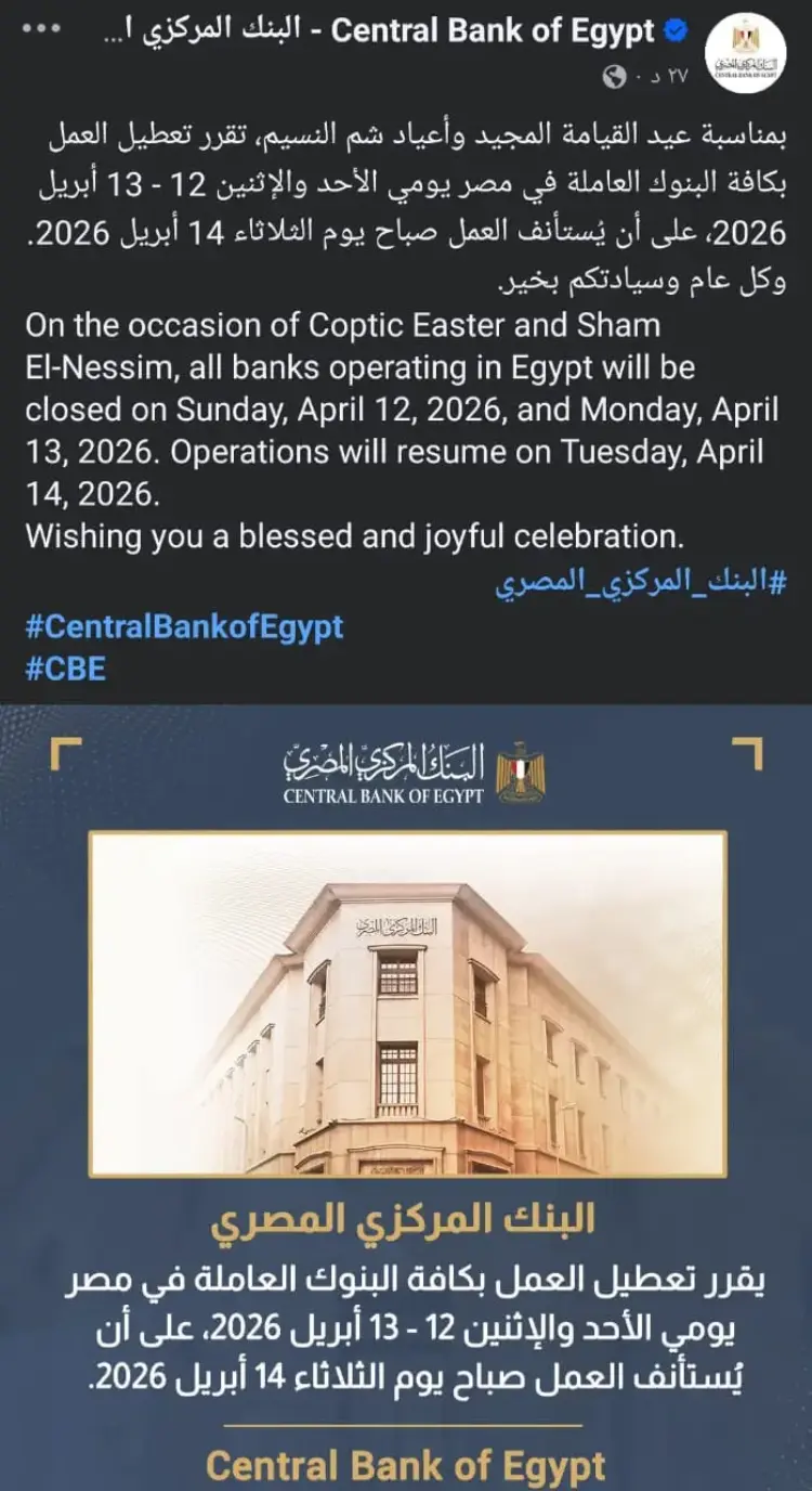 وأشار البنك في بيان اليوم إلى إجازة يومي الأحد والإثنين على أن إلى استئناف العمل صباح يوم الثلاثاء الموافق 14 أبريل 2026 في كافة البنوم في مصر.
