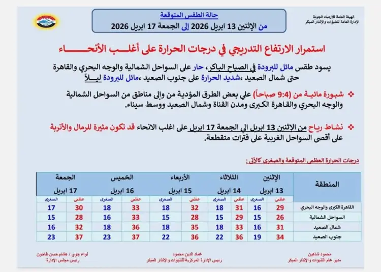 أعلنت هيئة الأرصاد الجوية عبر صفحتها الرسمية على فيسبوك عن درجات الحرارة المتوقعة من الاثنين 13 أبريل وحتى الجمعة 17 أبريل 2026، إذ تشهد القاهرة الكبرى والوجه البحري ارتفاعا تبدأ ذروته يوم الخميس لتسجل 33 درجة للعظمى و18 للصغرى، بينما تصل العظمى يوم الجمعة إلى 30 درجة، وتتراوح درجات الحرارة في السواحل الشمالية بين 26 درجة يوم الاثنين وتصل إلى 33 درجة يوم الخميس، قبل أن تنخفض بشكل طفيف لتسجل 28 درجة في نهاية الأسبوع، مع استمرار الأجواء المعتدلة ليلا في هذه المناطق.