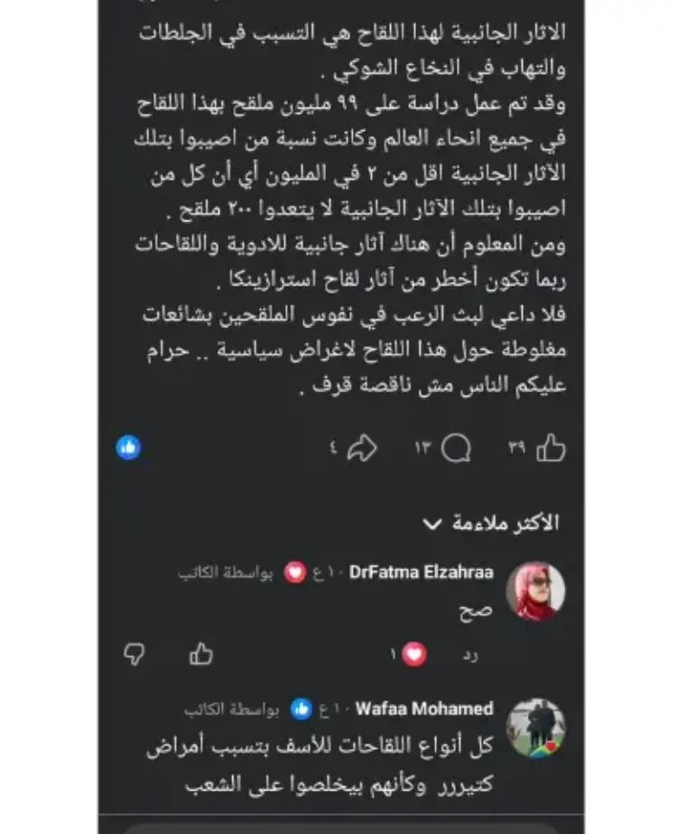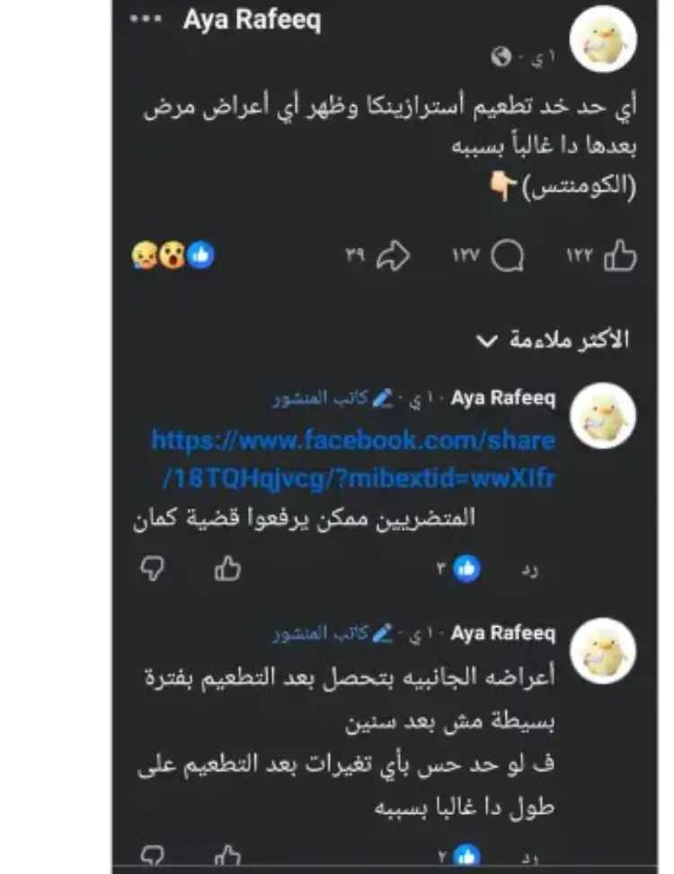 وطالب نشطاء بضرورة التوجه للمستشفيات لإجراء فحوصات طبية عاجلة للاطمئنان على الصحة العامة، مشيرين إلى أن اعترافات الشركة الأخيرة بآثار جانبية نادرة تستوجب الحذر الشديد تحت شعار ربنا يستر من اللي جاي.