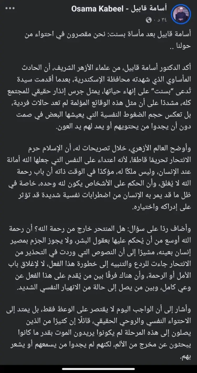 اعتبر الدكتور أسامة قابيل من علماء الأزهر الشريف أن الواقعة المؤلمة التي شهدتها محافظة الإسكندرية بإنهاء السيدة بسنت سليمان لحياتها تمثل جرس إنذار حقيقي للمجتمع المصري، مؤكدا أن مثل هذه الحوادث لم تعد مجرد حالات فردية، بل أصبحت تعكس حجم الضغوط النفسية الحادة التي يواجهها البعض في صمت دون الحصول على الدعم أو الاحتواء اللازم.