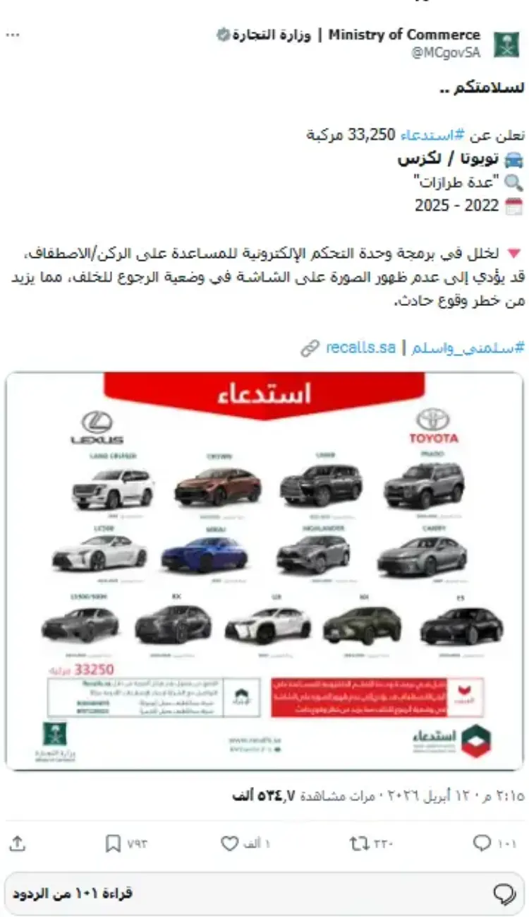 أعلنت وزارة التجارة السعودية، اليوم الأحد، عن استدعاء فني ضخم شمل 33,250 مركبة من طرازي تويوتا ولكزس بمختلف موديلاتها الحديثة المنتجة بين عامي 2022 و2025.