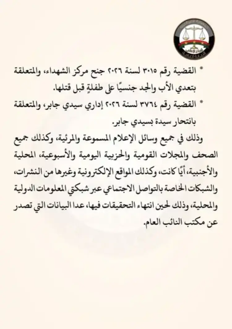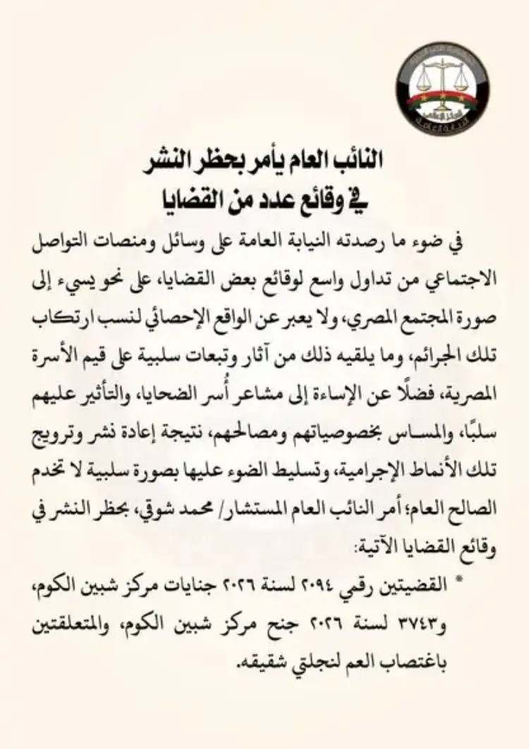 ويستمر هذا الحظر ساريًا حتى انتهاء التحقيقات الرسمية، مع استثناء وحيد للبيانات الرسمية التي قد تصدر عن مكتب النائب العام حصريًا لتوضيح مستجدات القضايا للرأي العام وفق المسار القانوني.