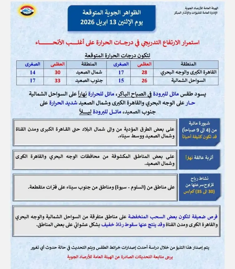 كشفت الهيئة العامة للأرصاد الجوية عن توقعات حالة الطقس اليوم الإثنين 13 أبريل 2026 متوقعة أن يسود الارتفاع التدريجي في درجات الحرارة في أغلب المحافظات ومنها الإسكندرية، حيث وأفاد التقرير الرسمي بأن السواحل الشمالية تشهد أجواء مائلة للحرارة خلال ساعات النهار.