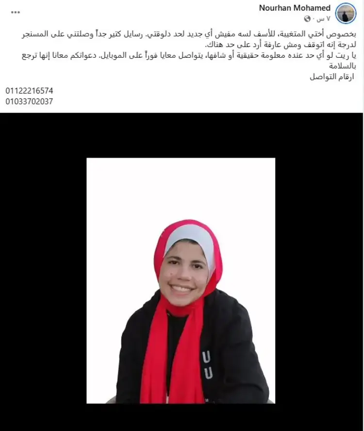 أوضحت نورهان محمد، أن شقيقتها اختفت منذ يوم 11 أبريل الجاري، بعد خروجها من المنزل متجهة إلى إحدى الجامعات، دون أن تعود حتى الآن، ما أثار قلقا بالغا لدى الأسرة.