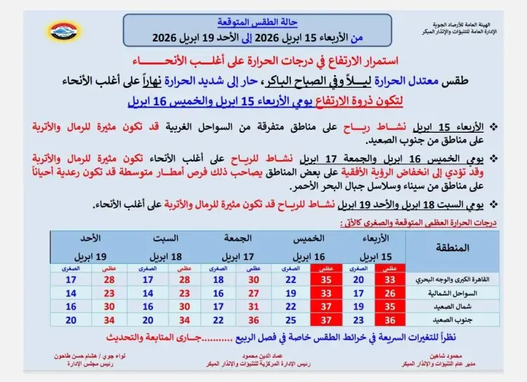 أخبار الطقس غدا الأربعاء 15 أبريل 2026.. موجة حارة