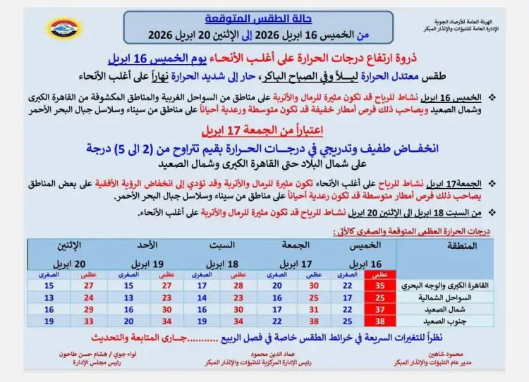 أعلنت الهيئة العامة للأرصاد الجوية اليوم الثلاثاء 14 أبريل 2026 عبر صفحتها الرسمية على فيسبوك عن حالة الطقس في الأيام المقبلة، حيث كشف البيان عن مرور البلاد بذروة ارتفاع في درجات الحرارة يوم الخميس 16 أبريل ليسود طقس شديد الحرارة نهارا على أغلب الأنحاء ومعتدل ليلا وفي الصباح الباكر.