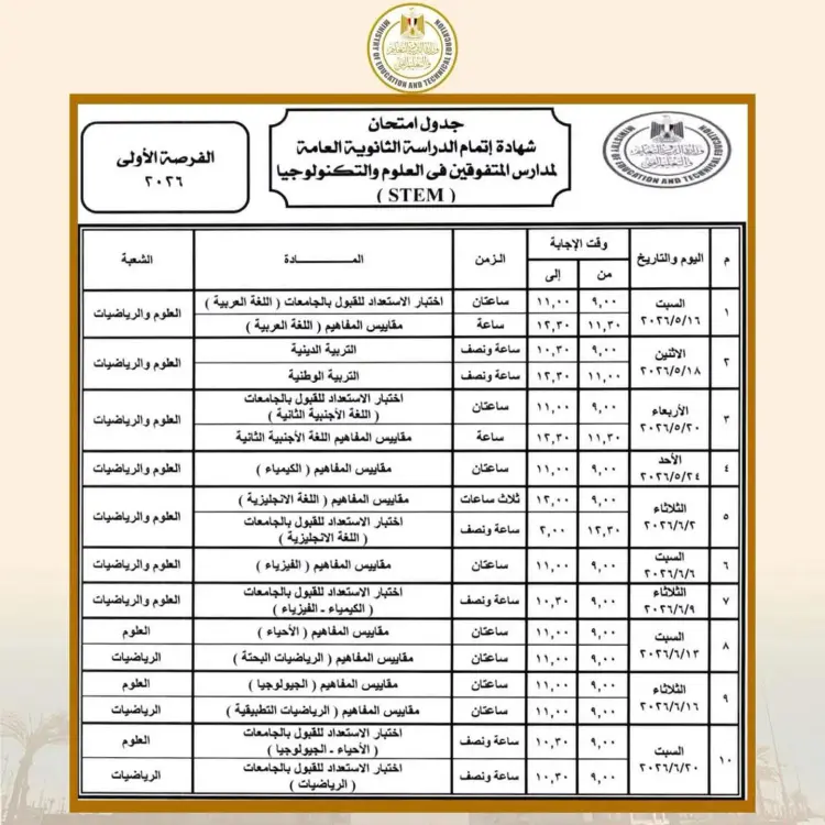 أعلنت وزارة التربية والتعليم والتعليم الفني الجدول الرسمي الخاص بماراثون امتحانات شهادة إتمام الدراسة الثانوية العامة لمدارس المتفوقين في العلوم والتكنولوجيا، حيث كشفت الوزارة عن جدول امتحانات الثانوية العامة بمدارس ستيم 2026 شعبة الرياضيات التي تنطلق رسميا في شهر مايو المقبل وتستمر حتى نهاية شهر يونيو من العام الجاري.