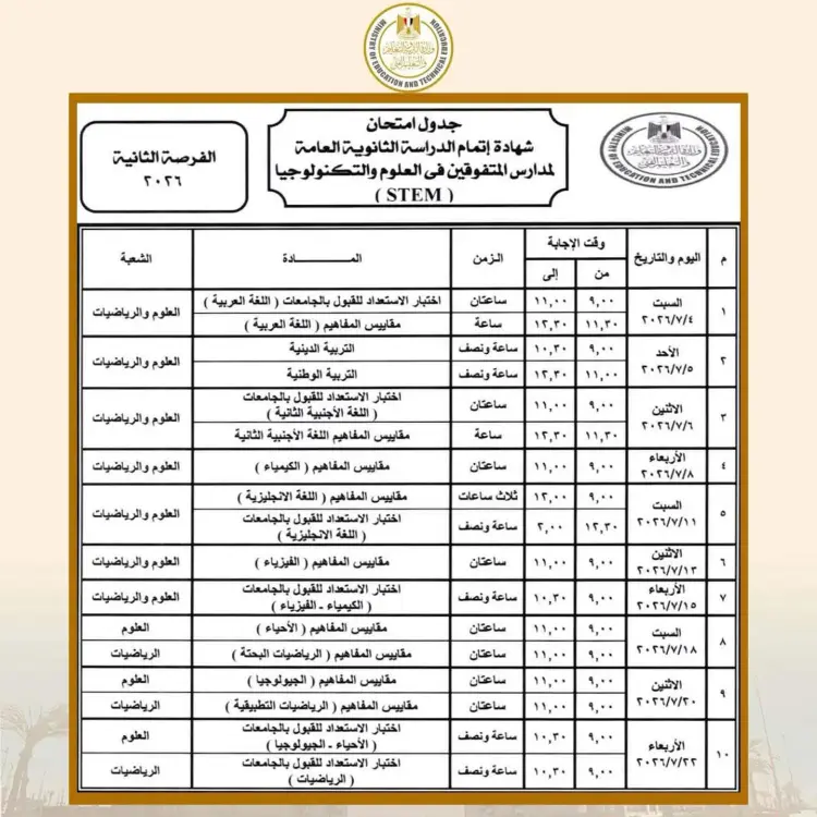 جدول امتحانات الثانوية العامة stem لعام 2026 الفرصة الثانية.. متى الانطلاق؟