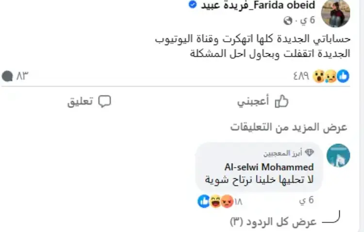 اختتمت عبيد استغاثتها بمطالبة أجهزة وزارة الداخلية وشرطة مكافحة جرائم تقنية المعلومات بالتحقيق في الواقعة، مشيرة إلى أن حياتها المهنية والمادية باتت مهددة بالانهيار.