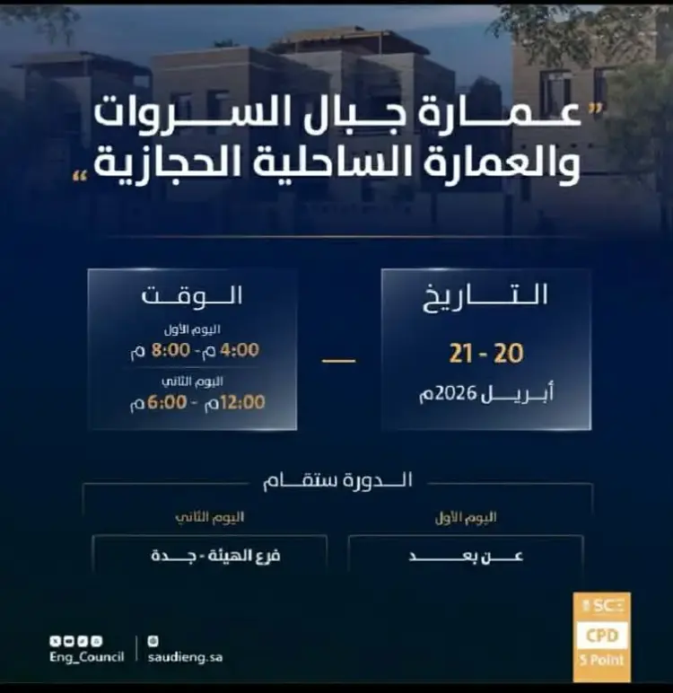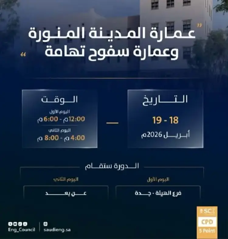 كما تقام دورة «عمارة المدينة المنورة وعمارة سفوح تهامة» خلال يومي 18 و19 أبريل 2026، حيث تبدأ فعاليات اليوم الأول في فرع الهيئة بجدة من الساعة 12:00 ظهرا إلى 6:00 مساء، بينما يكون اليوم الثاني «عن بعد» من الساعة 4:00 عصرا وحتى 8:00 مساء. ويتاح للمهتمين التقديم والالتحاق بالبرامج التدريبية عبر المنصة الإلكترونية التابعة للهيئة السعودية للمهندسين من خلال الرابط (https://training.saudieng.sa/)، وتمنح هذه الدورات المشاركين 5 نقاط معتمدة في برنامج التطوير المهني المستمر (CPD).