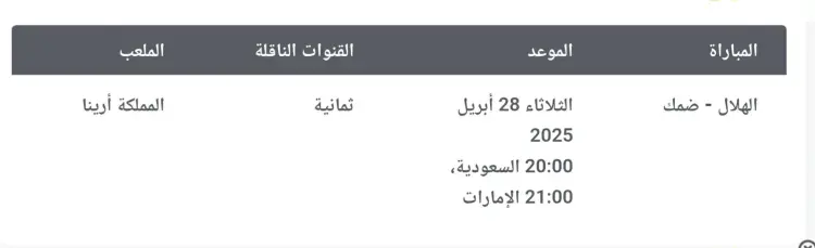 يحتضن ملعب «المملكة أرينا» هذه المواجهة يوم الثلاثاء الموافق 28 أبريل 2026، حيث تقرر انطلاق صافرة البداية في تمام الساعة 20:00 بتوقيت المملكة العربية السعودية، بينما يكون موعد الانطلاق في تمام الساعة 21:00 بتوقيت الإمارات العربية المتحدة.