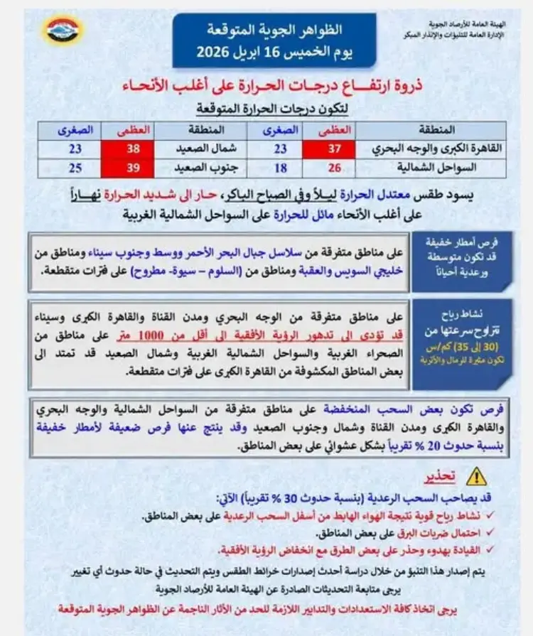 وأعلنت الهيئة العامة للأرصاد الجوية اليوم الأربعاء في بيان تفصيلي عن تفاصيل حالة الطقس المتوقعة ليوم غد الخميس 16 أبريل 2026، حيث استمرار ارتفاع درجات الحرارة في كافة أنحاء البلاء حيث ستصل العظمى بالقاهرة 37 درجة.